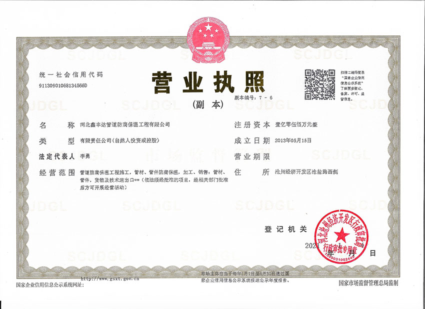河北鑫豐達(dá)管道防腐保溫工程有限公司坐落于滄州市開發(fā)區(qū),通過ISO9000質(zhì)量管理體系認(rèn)證。本廠擁有工程師4名、技術(shù)人員30名,員工60人,注冊(cè)資金5500萬(wàn)元。專門從事3pe/2pe防腐鋼管、保溫防腐鋼管、防腐螺旋鋼管、水泥砂漿防腐鋼管、等配套工程施工,以及防腐材料研發(fā)制造的大型專業(yè)化企業(yè)。是河北省防腐保溫行業(yè)協(xié)會(huì)理事單位。年生產(chǎn)能力500萬(wàn)平方米。
